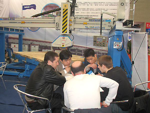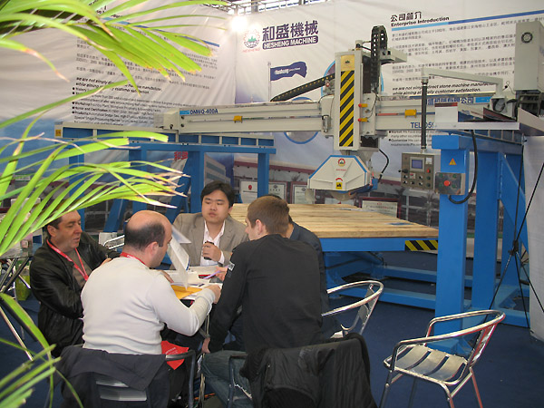 展會現場工作人員講解設備 圖片展示發布時間:2017-04-27 游覽:14853和盛石材機械專業生產石材加工成套設備;主要有石材切割機,石材拋光機,石材切邊機;異形類切機等幾大類;主產品有液壓組合切石機,液壓橋式切石機,全自動花崗巖條板磨光機,礦山切石機,自動切邊機,紅外線橋切機,橋式中切機,板底修平機,橋式組合切割機等等。現有新老廠房使用面積約90000平方,有機械鑄造廠、機械加工車間、機械生產車間和技術研發室等,產品暢銷全國,深受用戶好評,并遠銷東南亞等國家和地區,歡迎各界朋友來廠參觀考察,我們將竭誠為您服務。