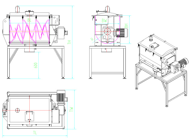 該機(jī)型為臥式筒體,單軸雙螺帶對(duì)稱分布結(jié)構(gòu)?;旌蠙C(jī)筒體為U型,在頂蓋或筒體上部有進(jìn)料口,根據(jù)用戶需要其上可裝噴霧加液裝置。筒體內(nèi)裝有單軸轉(zhuǎn)子,轉(zhuǎn)子是由軸、橫撐及螺帶組成。