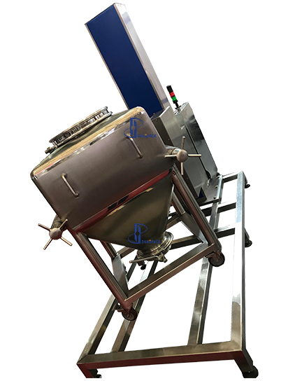 2,回轉(zhuǎn)體(混合料斗)與回轉(zhuǎn)軸線成30°夾角,混合料斗中的物料隨回轉(zhuǎn)體翻動外,同時沿斗壁做切向運動,產(chǎn)生 強烈的翻轉(zhuǎn)和高速的切向運動,從而達到混合效果。