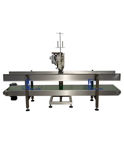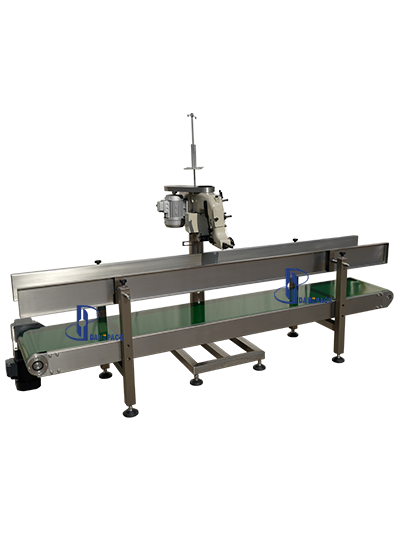 工作方式:裝縫包機裝配在輸送機上;開啟電源后輸送機開始運轉(zhuǎn),向前輸送裝滿物料的袋子,當袋子到達縫包機壓腳處,接近開關(guān)感應(yīng)到袋子自動啟動縫包機,運行到設(shè)定的時間達到時自動停止,縫好每一袋時手推袋角切刀剪切線辮。