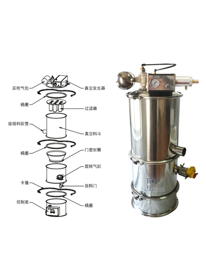 氣動式真空上料機(jī)是利用壓縮空氣通過真空發(fā)生器產(chǎn)生高真空實(shí)現(xiàn)對物料的輸送,不需要機(jī)械式真空泵,具有結(jié)構(gòu)簡單、體積小、免維修、噪音低、控制方便、消除物料靜電和符合GMP要求等優(yōu)點(diǎn)