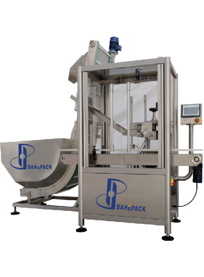 整機主體不銹鋼結(jié)構(gòu),有機玻璃外罩,可打開; PLC控制、觸摸屏人機界面顯示,操作簡便; 儲蓋料斗底部的爬坡輸送帶自動理蓋,方向?qū)Φ南蛏咸?,方向反的自動跌落到儲蓋料斗;